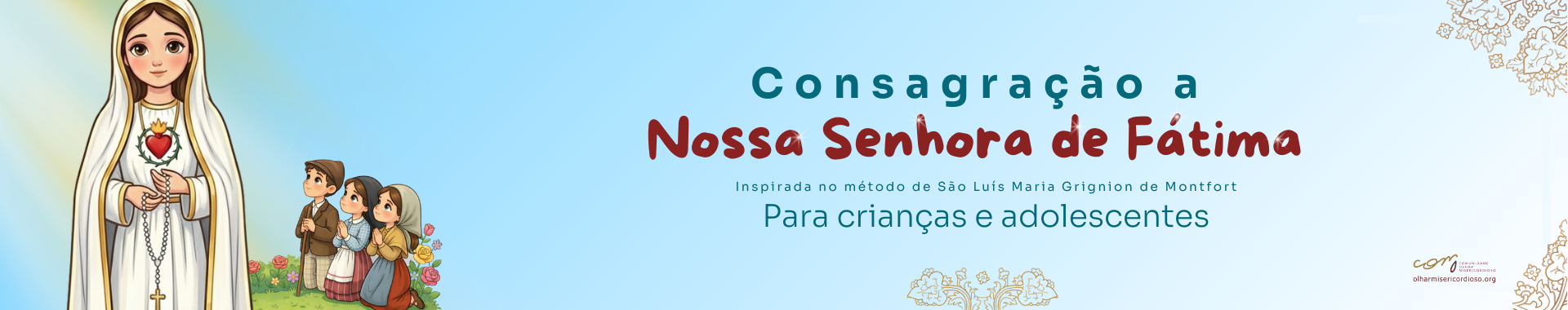 A Consagração das Crianças e Adolescentes, inspirada no método de São Luis Maria Grignion de Monfort, é uma das obras de misericórdia da Comunidade Olhar Misericordioso e tem como objetivo desabrochar no coração dos mais jovens um amor filial a Virgem Maria, a devoção ao Santo Rosário e a intimidade com Jesus, trazendo-os, desde a juventude, para uma caminhada espiritual por meio das orações diárias. Deseja-se que essa Consagração seja apenas o início de um lindo projeto que Deus tem para cada um dos seus “pequeninos”. Ela não substitui a Consagração que se faz através do método de São Luís, com a leitura do Tratado e a preparação através dos Exercícios Espirituais. Por isso, é importante que, ao atingir a idade adulta, todos façam a real entrega e compromisso a Jesus por Maria.